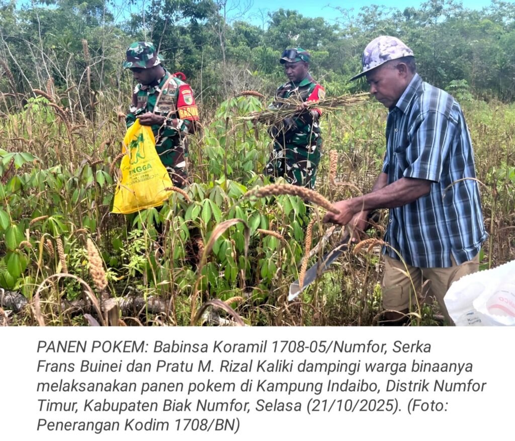 TOP-NEWS.id, NUMFOR – Dalam upaya mendukung program ketahanan pangan (hanpangan), Babinsa Koramil 1708-05/Numfor, Serka Frans Buinei dan Pratu M. Rizal Kaliki terus menunjukkan kepeduliannya terhadap para petani di wilayah binaan. Keduanya turun langsung ke lapangan mendampingi petani saat panen tanaman pokem di Kampung Indaibo, Distrik Numfor Timur, Kabupaten Biak Numfor, Papua, Selasa (21/10/2025).