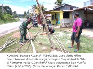 TOP-NEWS.id, BIAK BARAT – Dalam rangka meningkatkan kerja sama di wilayah binaan, Babinsa Koramil 1708-03/Biak Barat Serda Teriyanus Mambrasar bantu warga mendirikan rangka tenda di halaman Gereja Bethel Wardo, Kampung Yomdori, Distrik Biak Barat, Kabupaten Biak Numfor, Provinsi Papua Barat, Senin (10/6/2024).