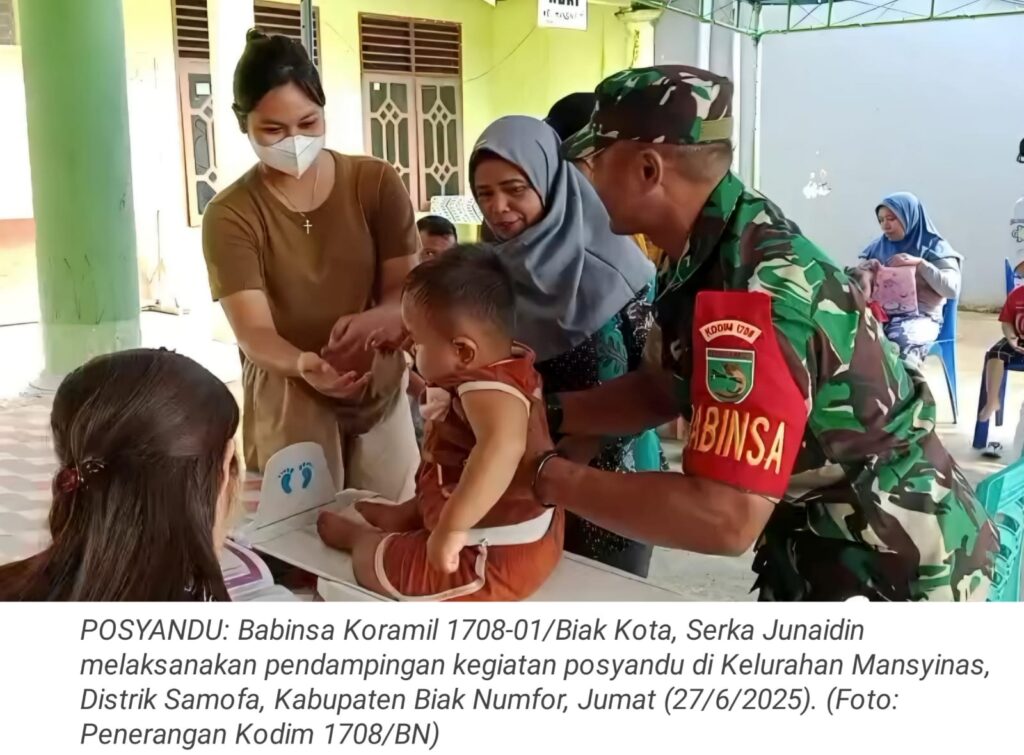 TOP-NEWS.id, BIAK – Bentuk kepedulian terhadap kesehatan masyarakat terus ditunjukkan oleh Babinsa Koramil 1708-01/Biak Kota, Serka Junaidin, yang melaksanakan pendampingan kegiatan posyandu di Kelurahan Mansyinas, Distrik Samofa, Kabupaten Biak Numfor, Papua, Jumat (27/6/2025).