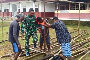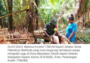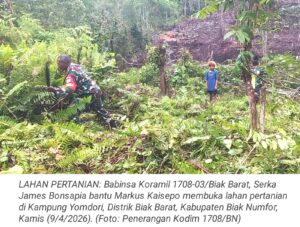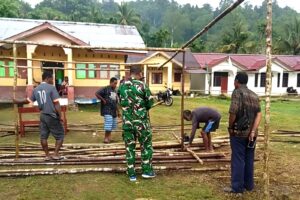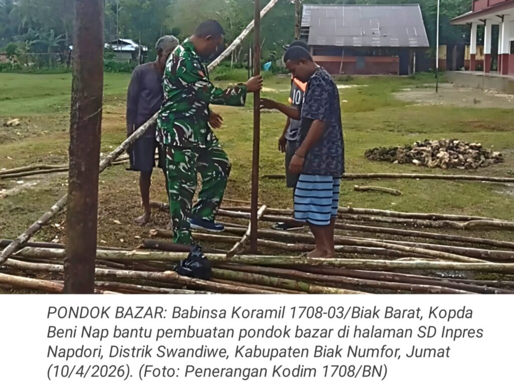 TOP-NEWS.id, BIAK BARAT – Kepedulian terhadap kegiatan masyarakat kembali ditunjukkan oleh Babinsa Koramil 1708-03/Biak Barat, Kopda Beni Nap dengan membantu pembuatan pondok bazar di halaman SD Inpres Napdori, Distrik Swandiwe, Kabupaten Biak Numfor, Papua, Jumat (10/4/2026).