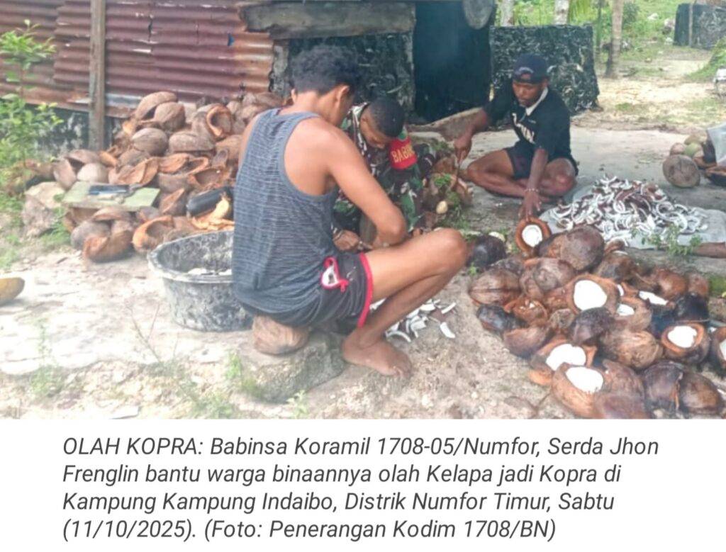 TOP-NEWS.id, NUMFOR – Kepedulian TNI terhadap kesejahteraan masyarakat kembali terlihat di wilayah Kabupaten Biak Numfor, Papua, Babinsa Koramil 1708-05/Numfor, Serda Jhon Frenglin, turun langsung membantu warga binaannya mengolah buah kelapa menjadi kopra di Kampung Indaibo, Distrik Numfor Timur, Sabtu (11/10/2025).