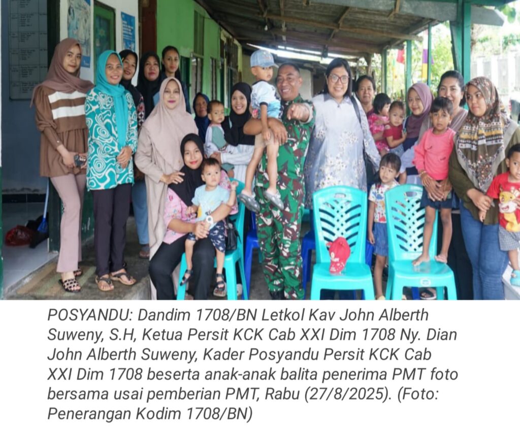 Kegiatan pemberian PMT oleh Persit KCK Cabang XXI Dim 1708/BN tidak hanya membantu memenuhi gizi anak-anak, tetapi juga mempererat silaturahmi dengan masyarakat serta menumbuhkan kesadaran bersama untuk menjaga kesehatan demi terciptanya generasi sehat, kuat, dan cerdas di masa depan.