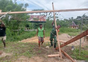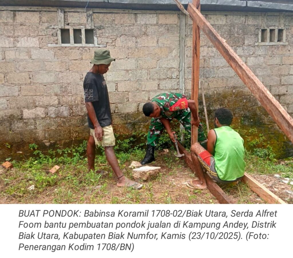 TOP-NEWS.id, BIAK UTARA – Upaya mempererat kebersamaan sekaligus membantu meningkatkan perekonomian warga, Babinsa Koramil 1708-02/Biak Utara, Serda Alfret Foom bantu buat pondok jualan di Kampung Andey, Distrik Biak Utara, Kabupaten Biak Numfor, Papua, Kamis (23/10/2025).