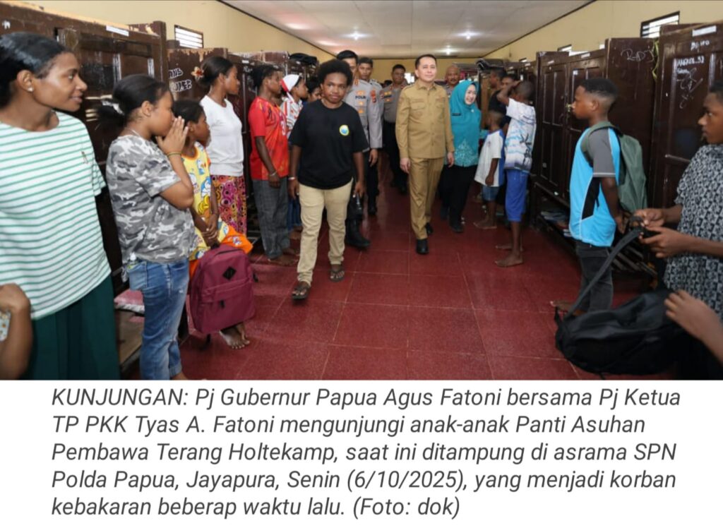 TOP-NEWS.id, JAYAPURA – Penjabat (Pj) Gubernur Papua Agus Fatoni bersama Pj. Ketua TP PKK Tyas A. Fatoni mengunjungi anak-anak Panti Asuhan Pembawa Terang Holtekamp yang saat ini sementara menempati asrama SPN Polda Papua, Jayapura, Papua, Senin (6/10/2025).