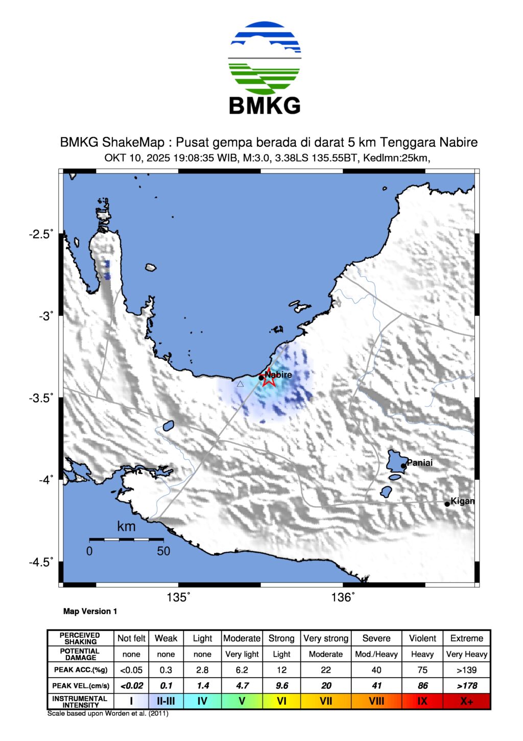 TOP-NEWS.id, JAKARTA – Jumat 10 Oktober 2025 pukul 21.08.35 WIT wilayah Kabupaten Nabire diguncang gempa tektonik. Hasil analisis BMKG menunjukkan gempabumi ini memiliki parameter update dengan magnitudo M3.0.