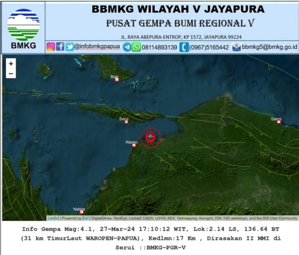 TOP-NEWS.id, JAKARTA – Rabu sore (27/3/2024) tepatnya pukul 17.10.12 WIT, wilayah Waropen, Papua diguncang gempa tektonik. Hasil analisis BMKG menunjukkan gempa bumi memiliki parameter kekuatan M4.1. Episenter gempa bumi terletak pada koordinat 2.14° LS dan 136.64° BT, pada jarak 31 km TimurLaut WAROPEN-PAPUA. Berlokasi di laut dengan kedalaman 17 km.