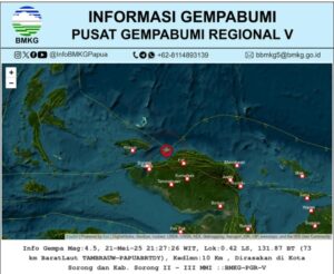 TOP-NEWS.id, JAYAPURA – Rabu (21/5/2025) pukul 21:27:26 WIT, Kota Sorong, Papua Barat Daya diguncang gempa bumi tektonik. Hasil analisis BMKG menunjukkan gempa bumi memiliki parameter magnitudo M4.5.