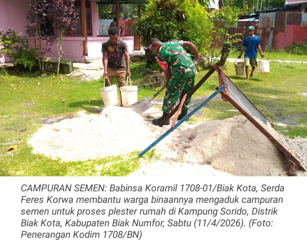 TOP-NEWS.id, BIAK – Babinsa Koramil 1708-01/Biak Kota, Serda Feres Korwa membantu warga binaannya mengaduk campuran semen untuk proses plester rumah warga Kampung Sorido, Distrik Biak Kota, Kabupaten Biak Numfor, Papua, Sabtu (11/4/2026).