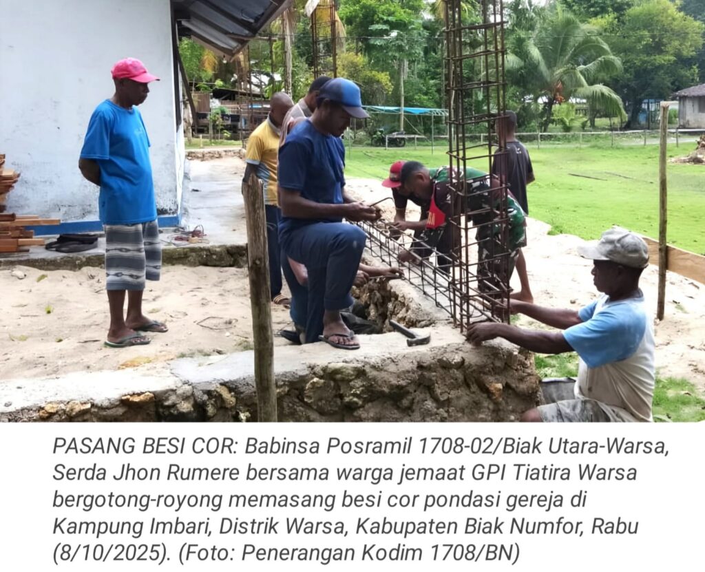 TOP-NEWS.id, WARSA – Dalam semangat kebersamaan dan kepedulian terhadap kehidupan beragama, Babinsa Posramil 1708-02/Biak Utara-Warsa, Serda Jhon Rumere bersama warga jemaat Gereja Pekabaran Injil (GPI) Tiatira Warsa melaksanakan kegiatan gotong-royong memasang besi cor pondasi gereja di Kampung Imbari, Distrik Warsa, Kabupaten Biak Numfor, Papua, Rabu (8/10/2025).