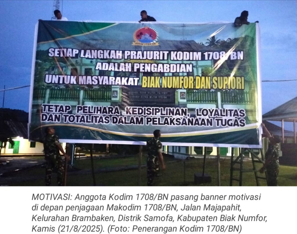 Dalam pelaksanaannya, Kodim 1708/BN terus berupaya menumbuhkan semangat pengabdian dan disiplin di kalangan prajuritnya. Salah satu langkah nyata yang dilakukan, adalah dengan memasang banner motivasi di depan penjagaan Makodim 1708/BN, Jalan Majapahit, Kelurahan Brambaken, Distrik Samofa, Kabupaten Biak Numfor.