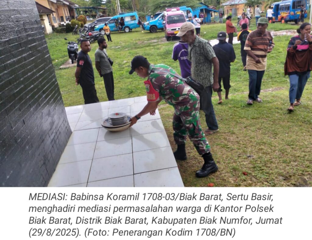 TOP-NEWS.id, BIAK BARAT – Kehadiran Babinsa di tengah masyarakat menjadi wujud nyata kepedulian TNI terhadap warga binaannya. Hal ini ditunjukkan oleh Babinsa Koramil 1708-03/Biak Barat, Sertu Basir, yang menghadiri mediasi permasalahan warga di Kantor Polsek Biak Barat, Distrik Biak Barat, Kabupaten Biak Numfor, Papua, Jumat (29/8/2025).