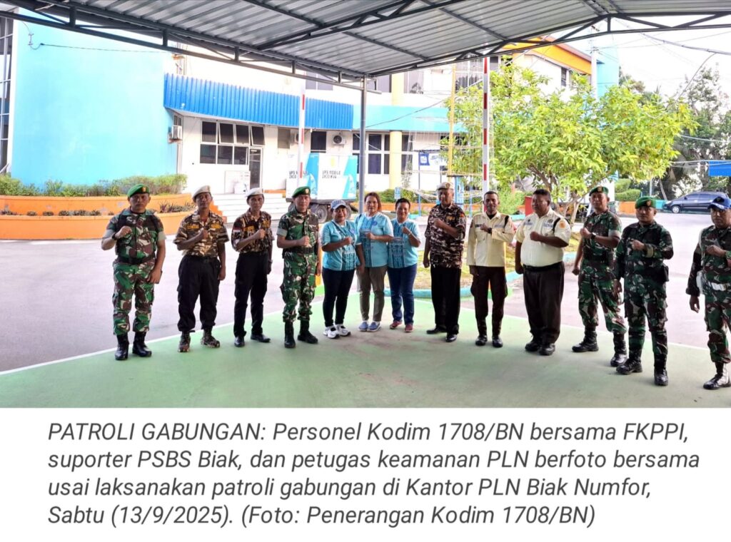 TOP-NEWS.id, BIAK – Untuk menjaga stabilitas keamanan dan ketertiban di wilayah Kabupaten Biak Numfor, Kodim 1708/BN bersama Forum Komunikasi Putra Putri Purnawirawan TNI-Polri (FKPPI) serta suporter PSBS Biak melaksanakan patroli gabungan di sejumlah titik di Kota Biak, Sabtu (13/9/2025).