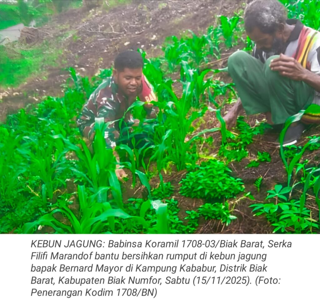 TOP-NEWS.id, BIAK BARAT – Babinsa Koramil 1708-03/Biak Barat, Serka Filifi Marandof membantu salah satu warga binaannya, Bernard Mayor, membersihkan kebun jagung miliknya di Kampung Kababur, Distrik Biak Barat, Kabupaten Biak Numfor, Papua, Sabtu (15/11/2025).