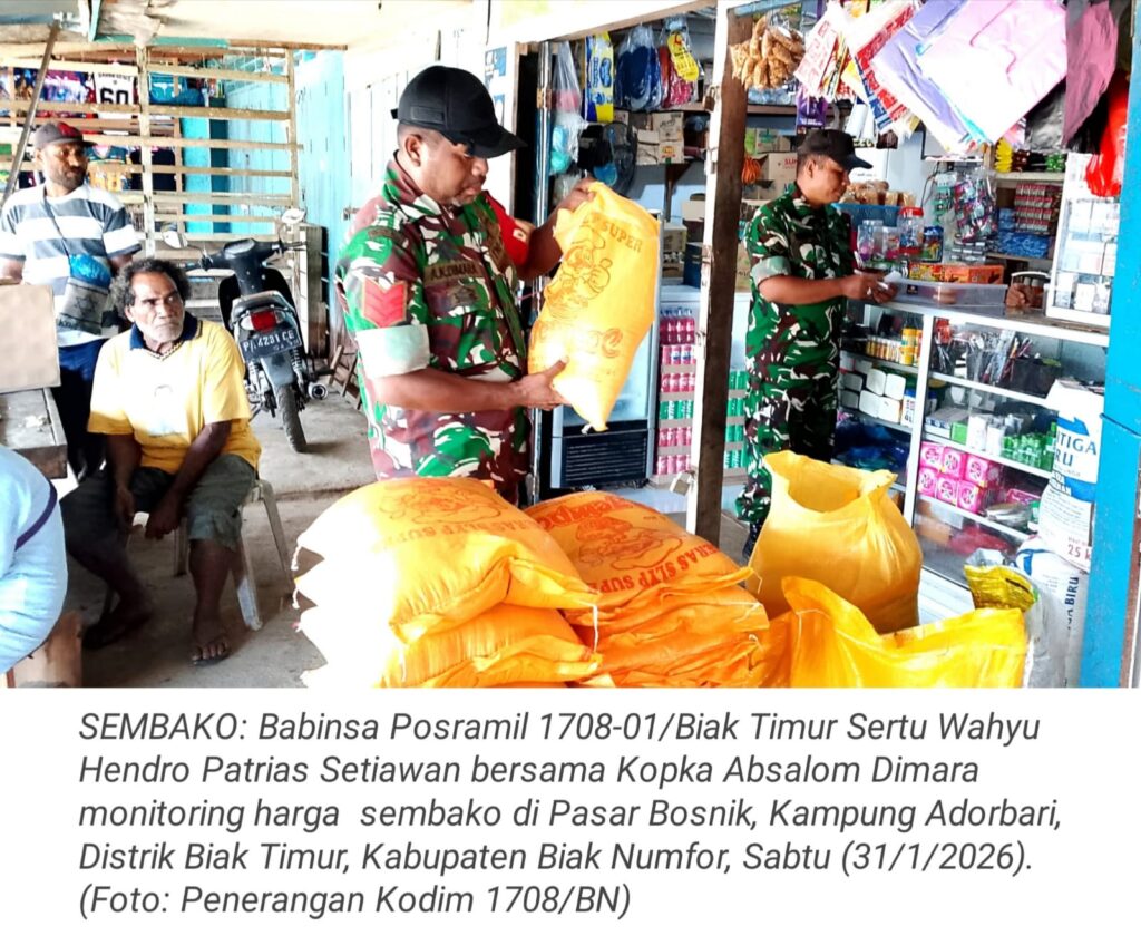 TOP-NEWS.id, BIAK TIMUR – Babinsa Posramil 1708-01/Biak Timur Sertu Wahyu Hendro Patrias Setiawan bersama Kopka Absalom Dimara melaksanakan kegiatan monitoring harga kebutuhan pokok atau sembako di Pasar Bosnik, Kampung Adorbari, Distrik Biak Timur, Kabupaten Biak Numfor, Papua, Sabtu (31/1/2026).