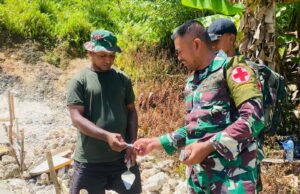 Tim Kesehatan Dankesyah 17.4.03 Biak membagikan vitamin kepada anggota Satgas TMMD 128 setiap hari untuk jaga stamina. (Foto: Penerangan Kodim 1708/BN)