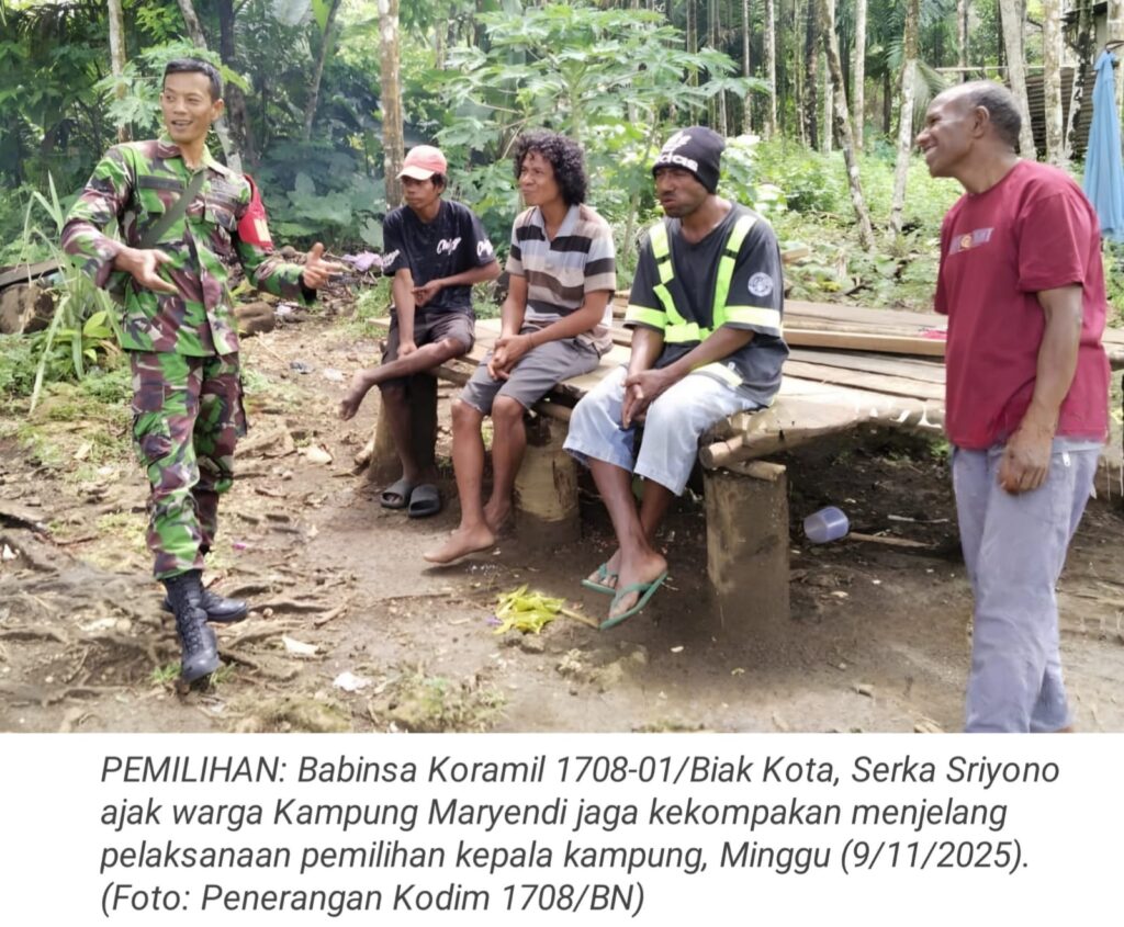 TOP-NEWS.id, BIAK – Upaya menjaga keharmonisan dan keamanan lingkungan menjelang pelaksanaan pemilihan kepala kampung serentak di wilayah Papua, Babinsa Koramil 1708-01/Biak Kota, Serka Sriyono, melaksanakan komunikasi sosial (komsos) dengan warga Kampung Maryendi, Distrik Samofa, Kabupaten Biak Numfor, Papua, Minggu (9/11/2025).