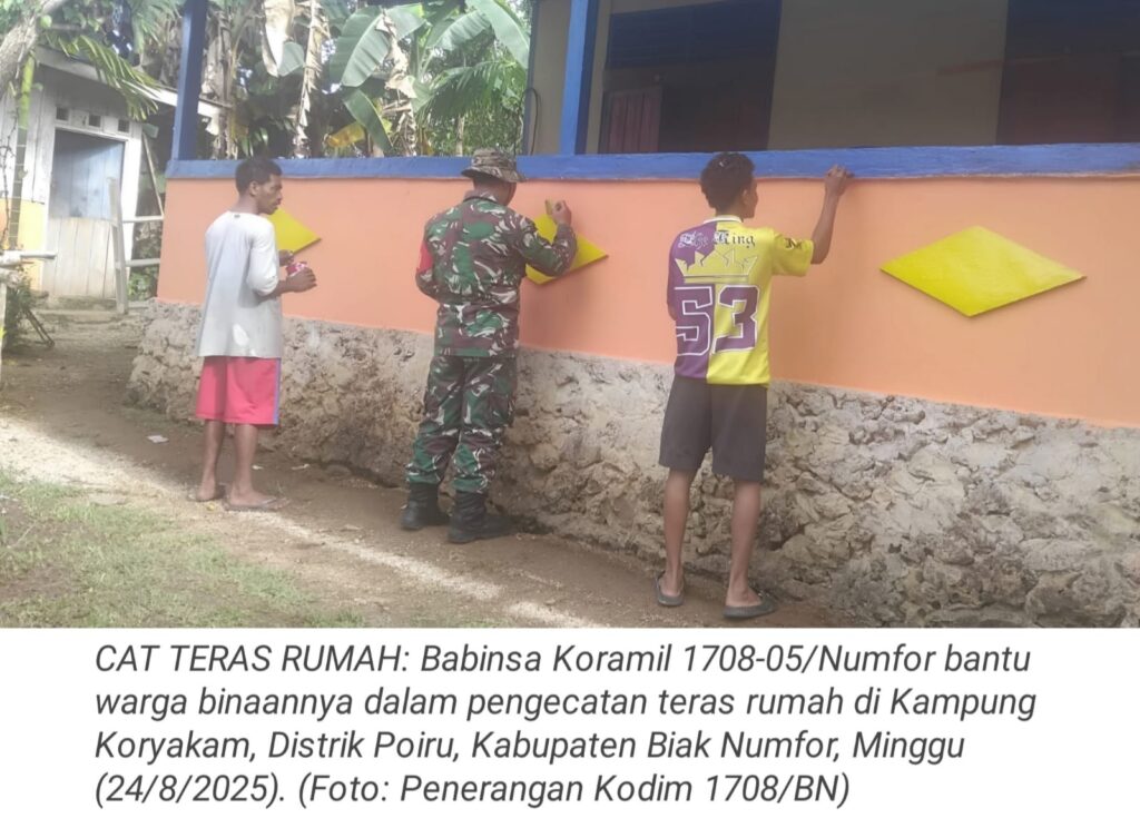 TOP-NEWS.id, NUMFOR – Kepedulian Babinsa kembali terlihat di tengah masyarakat, Babinsa Koramil 1708-05/Numfor, Serka Sampurno turun langsung membantu warga binaannya melakukan pengecatan teras rumah di Kampung Koryakam, Distrik Poiru, Kabupaten Biak Numfor, Papua, Minggu (23/8/2025).