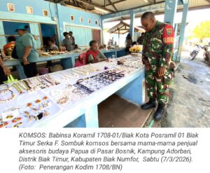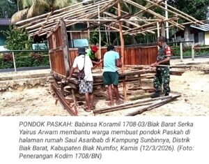 TOP-NEWS.id, WARSA – Kedekatan TNI dengan masyarakat kembali terlihat melalui aksi nyata Babinsa Posramil 1708-02/Biak Utara-Warsa Serma Saharudding bantu warga membangun pondok milik Andreas Krisifu di Kampung Karuiberik, Distrik Warsa, Kabupaten Biak Numfor, Papua, Sabtu (7/2/2026).