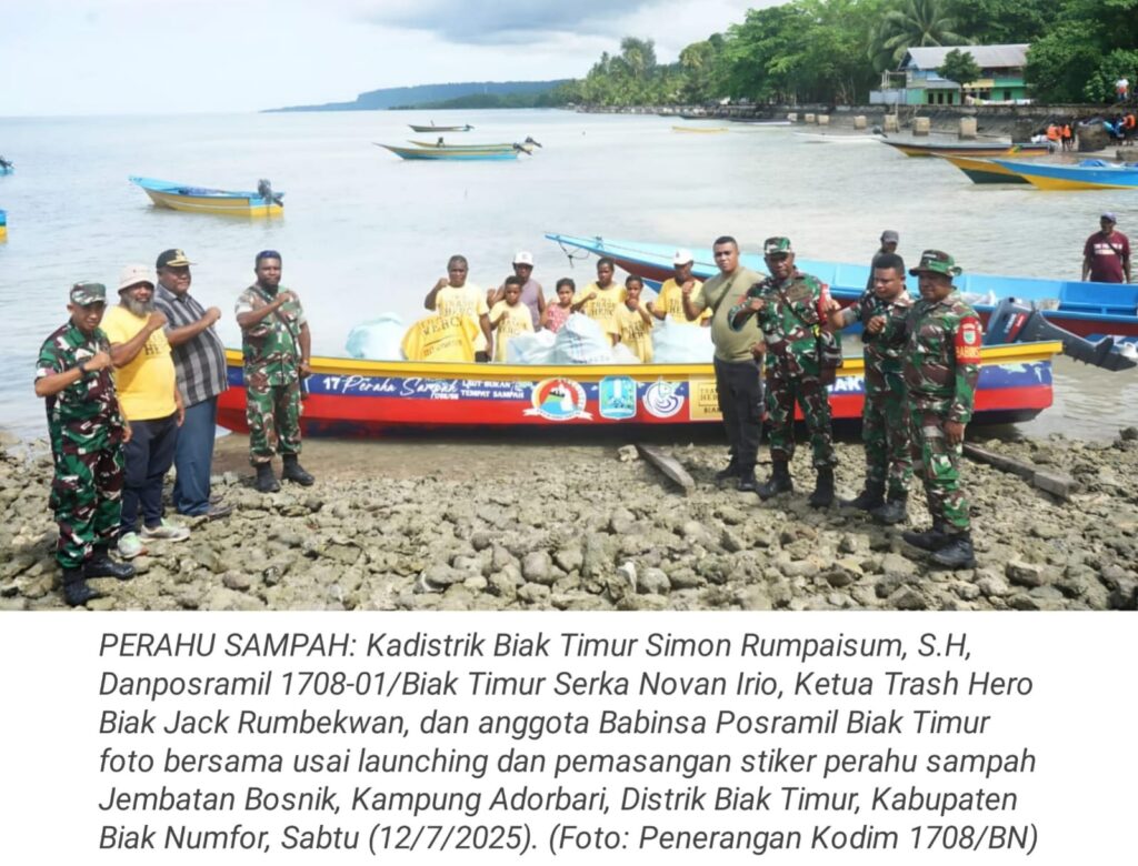 TOP-NEWS.id, BIAK TIMUR – Dalam rangka mendukung upaya pelestarian lingkungan, khususnya di wilayah pesisir dan laut, Kodim 1708/Biak Numfor ikut berpartisipasi dalam kegiatan peluncuran perahu sampah yang berlangsung di Jembatan Bosnik, Kampung Adorbari, Distrik Biak Timur, Kabupaten Biak Numfor, Provinsi Papua, Sabtu (12/7/2025).