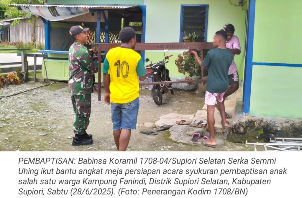 TOP-NEWS.id, SUPIORI – Sebagai wujud kepedulian dan perhatian terhadap warga binaannya, Babinsa Koramil 1708-04/Supiori Selatan, Serka Semmi Uhing ikut membantu mempersiapkan acara syukuran pembaptisan anak salah satu warga di Kampung Fanindi, Distrik Supiori Selatan, Kabupaten Supiori, Papua, Sabtu (28/6/2025).