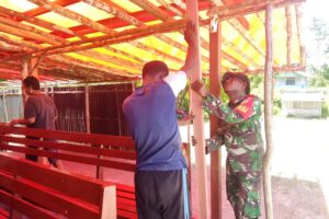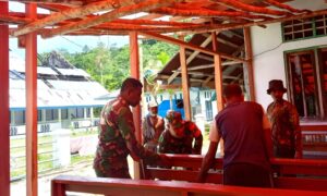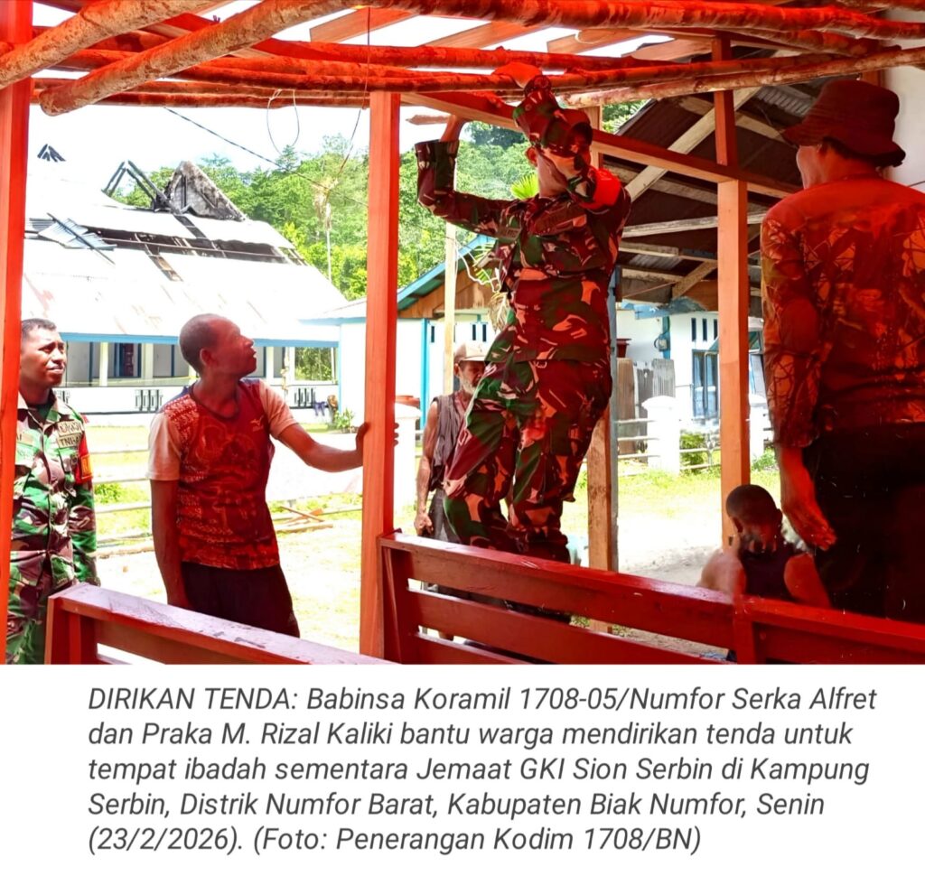 TOP-NEWS.id, NUMFORBabinsa Koramil 1708-05/Numfor Serka Alfret dan Praka M. Rizal Kaliki turun langsung membantu warga mendirikan tenda sebagai tempat ibadah sementara bagi Jemaat GKI Sion Serbin di Kampung Serbin, Distrik Numfor Barat, Kabupaten Biak Numfor, Papua, Senin (23/2/2025).