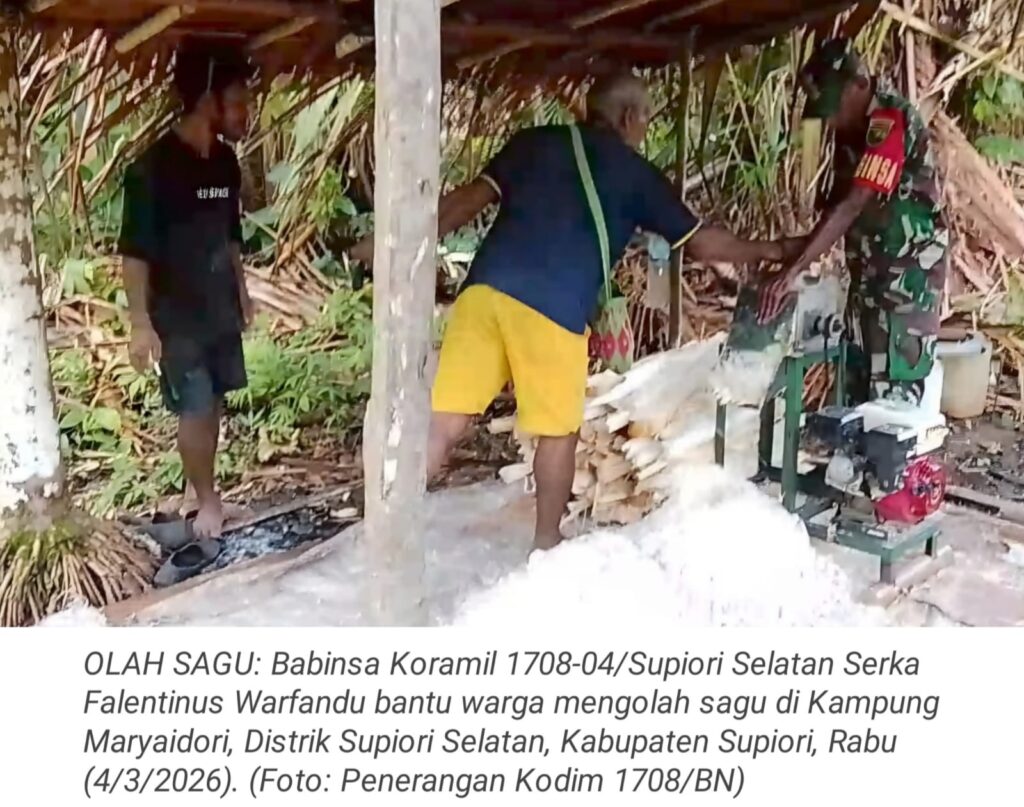 TOP-NEWS.id, SUPIORI – Wujud kepedulian terhadap ketahanan pangan terus ditunjukkan Babinsa Koramil 1708-04/Supiori Selatan Serka Falentinus Warfandu bantu warga mengolah sagu di Kampung Maryaidori, Distrik Supiori Selatan, Kabupaten Supiori, Papua, Rabu (4/3/2026).