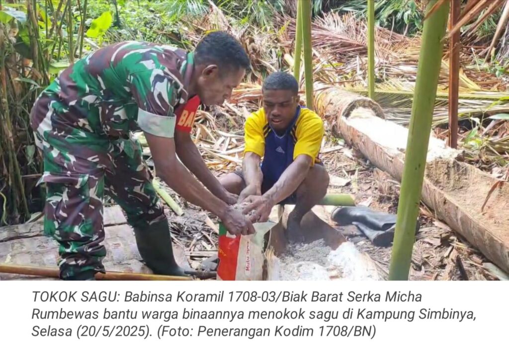 TOP-NEWS.id, WARSA – Sebagai bentuk nyata kedekatan TNI dengan masyarakat, Babinsa Koramil 1708-03/Biak Barat Serka Micha Rumbewas turun langsung membantu warga dalam kegiatan menokok sagu di Kampung Simbinya, Distrik Biak Barat, Kabupaten Biak Numfor, Papau, Selasa (20/5/2025).