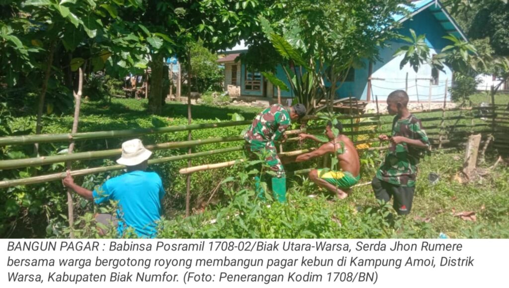 TOP-NEWS.id, WARSA – Sebagai bentuk kepedulian dan kedekatan Babinsa dengan masyarakat, Serda Jhon Rumere, Babinsa Posramil 1708-02/Biak Utara-Warsa turun langsung bergotong royong bersama warga mendirikan pagar kebun di Kampung Amoi, Distrik Warsa, Kabupaten Biak Numfor, Kamis (19/6/2025).