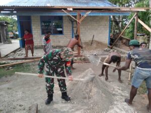 Manunggal Bersama Rakyat, Babinsa Numfor Bantu Aduk Campuran Semen Buat Pondasi Teras Rumah