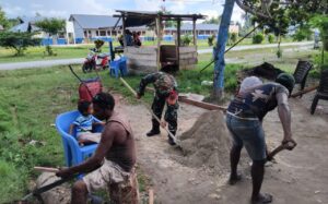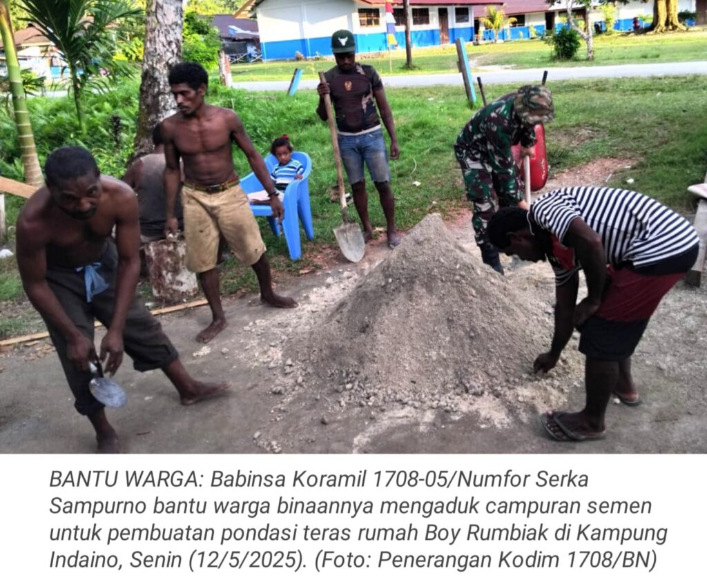 TOP-NEWS.id, Numfor – Babinsa Koramil 1708-05/Numfor Serka Sampurno bantu warga binaannya mengaduk campuran semen untuk pembuatan pondasi teras rumah keluarga Boy Rumbiak di Kampung Indaino, Distrik Numfor Timur, Kabupaten Biak Numfor, Papua, Senin (12/5/2025).