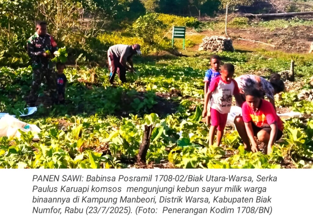 TOP-NEWS.id, WARSA – Upaya mendukung ketahanan pangan lokal dan mempererat hubungan dengan masyarakat, Babinsa Posramil 1708-02/Biak Utara-Warsa, Serka Paulus Karuapi melaksanakan komunikasi sosial (komsos) dengan mengunjungi kebun sayur milik warga binaannya di Kampung Manbeori, Distrik Warsa, Kabupaten Biak Numfor, Papua, Rabu (23/7/2025).