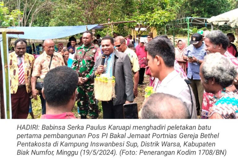 TOP-NEWS.id, WARSA - Babinsa Serka Paulus Karuapi menghadiri acara peletakan batu pertama, pembangunan Pos PI Bakal Jemaat Portnias Gereja Bethel...