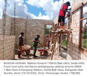 TOP-NEWS.id, BIAK TIMUR - Babinsa Posramil 1708-01/Biak Timur Koptu Absalom Dimara membantu warga memperbaiki Gedung Serba Guna Kantor Klasis Biak Timur di...