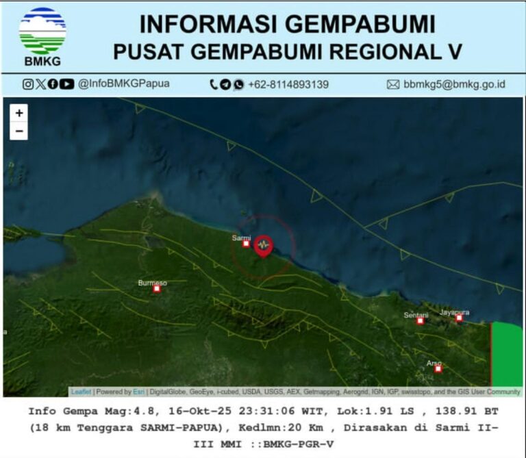 TOP-NEWS.id, JAYAPURA- Kamis (16/10/2025) pukul 23.31.06 WIT, wilayah Sarmi, Papua diguncang gempa tektonik. Hasil analisis BMKG menunjukkan gempabumi ini memiliki...