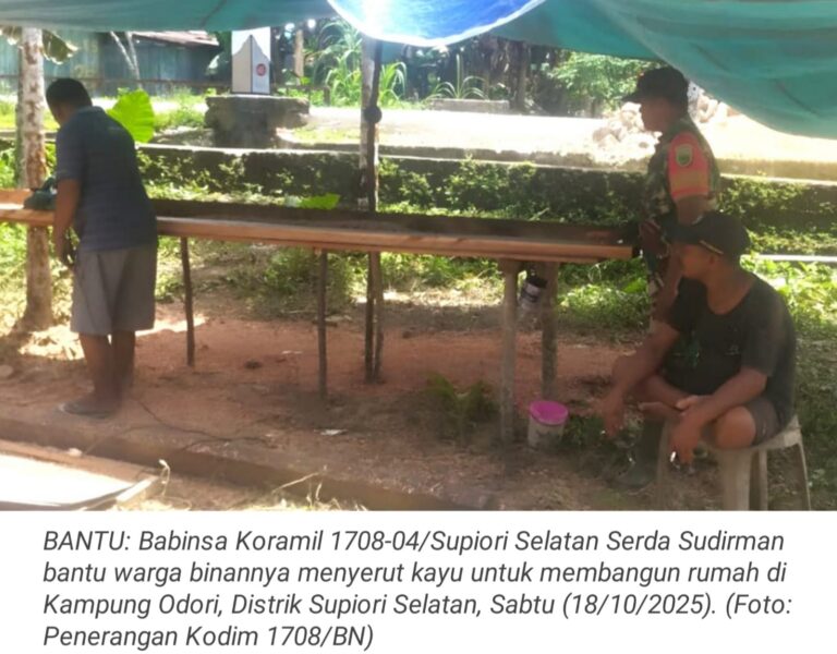 TOP-NEWS.id, SUPIORI - Wujud kepedulian terhadap warga binaannya, Babinsa Koramil 1708-04/Supiori Selatan, Serda Sudirman turut membantu proses pembangunan rumah milik...