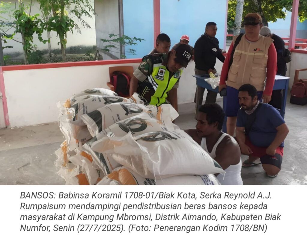 TOP-NEWS.id, BIAK – Dalam rangka mendukung kelancaran program bantuan sosial (bansos) dari pemerintah, Babinsa Koramil 1708-01/Biak Kota, Serka Reynold A.J. Rumpaisum melaksanakan pendampingan sekaligus membantu proses pendistribusian bantuan beras bansos kepada masyarakat di Kampung Mbromsi, Distrik Aimando, Kabupaten Biak Numfor, Papua, Senin (28/7/2025).