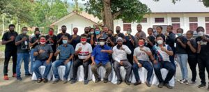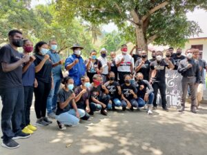 Waketum II Sub PB PON XX Klaster Kabupaten Jayapura Pdt Albert Yoku dan Danlanud Silas Papare Marsma TNI-AU Budhi Achmadi foto bersama Ketua ASKI DPD Papua Andrew Pahabol dan millenial barista di Puspinka Hawaii Sentani, Kabupaten Jayapura, Papua, Sabtu (21/8/2021). (Foto Yolanda Suebu/top-news.id)