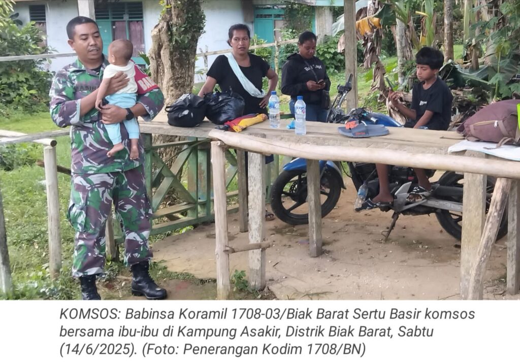 TOP-NEWS.id, BIAK BARAT – Sebagai bentuk kepedulian terhadap kesehatan dan masa depan anak-anak di wilayah binaannya, Babinsa Koramil 1708-03/Biak Barat, Sertu Basir melaksanakan kegiatan komunikasi sosial (komsos) bersama ibu-ibu di Kampung Asakir, Distrik Biak Barat, Kabupaten Biak Numfor, Papua, Sabtu (14/6/2025).