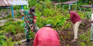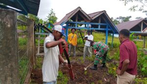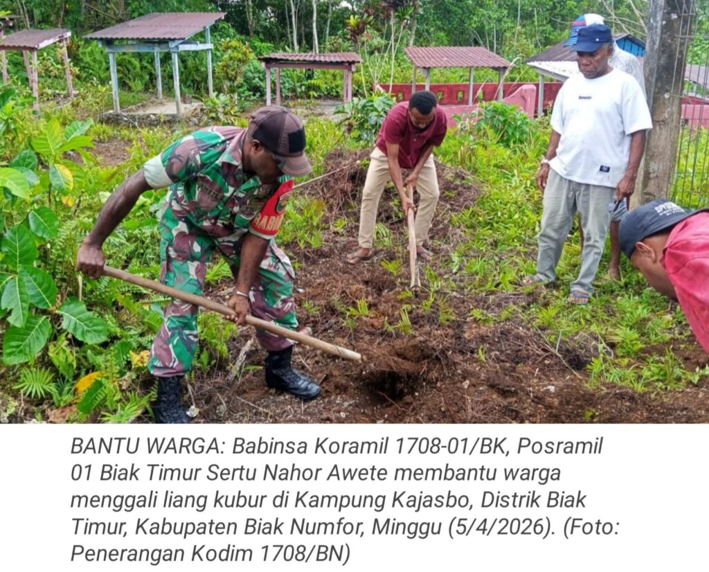 TOP-NEWS.id, BIAK TIMURBabinsa Koramil 1708-01/BK, Posramil 01 Biak Timur Sertu Nahor Awete membantu warga menggali liang kubur di Kampung Kajasbo, Distrik Biak Timur, Kabupaten Biak Numfor, Papua, Minggu (5/4/2026).