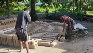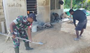 Dalam kegiatan itu, Babinsa mengunjungi rumah keluarga Isak Rumaseuw, warga yang berprofesi sebagai pengrajin batu tela. Tanpa ragu, Babinsa ikut turun tangan memindahkan batu tela yang baru selesai dicetak ke tempat penjemuran. Ia juga membantu mengaduk campuran semen yang menjadi bahan dasar pembuatan batu tela.
