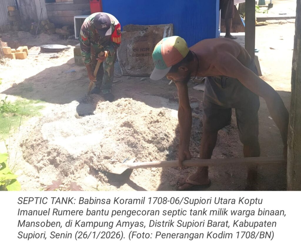 TOP-NEWS.id, SUPIORIBabinsa Koramil 1708-06/Supiori Utara Koptu Imanuel Rumere membantu pengecoran septic tank milik salah satu warga binaannya, Mansoben, di Kampung Amyas, Distrik Supiori Barat, Kabupaten Supiori, Papua, Senin (26/1/2026).