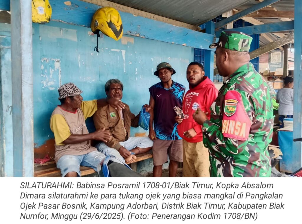TOP-NEWS.id BIAK TIMUR – Menjaga komunikasi dan mempererat hubungan dengan masyarakat, Babinsa Posramil 1708-01/Biak Timur, Kopka Absalom Dimara silaturahmi ke para tukang ojek yang biasa mangkal di Pangkalan Ojek Pasar Bosnik, Kampung Adorbari, Distrik Biak Timur, Kabupaten Biak Numfor, Papua, Minggu (29/6/2025).