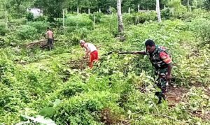 Dalam proses pembersihan lahan, Babinsa bersama pemilik kebun bekerja secara gotong-royong dengan membersihkan rumput liar dan semak belukar agar lahan siap digunakan untuk bercocok tanam.