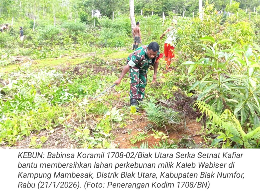 TOP-NEWS.id, BIAK UTARA – Babinsa Koramil 1708-02/Biak Utara Serka Setnat Kafiar membantu membersihkan lahan perkebunan milik Kaleb Wabiser, yang berlokasi di Kampung Mambesak, Distrik Biak Utara, Kabupaten Biak Numfor, Papua, Rabu (21/1/2025).