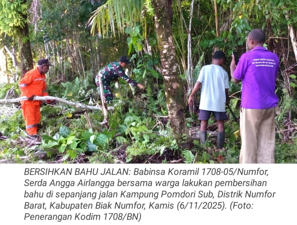 TOP-NEWS.id, NUMFOR – Babinsa Koramil 1708-05/Numfor, Serda Angga Airlangga bersama warga lakukan pembersihan bahu di sepanjang jalan Kampung Pomdori Sub, Distrik Numfor Barat, Kabupaten Biak Numfor, Papua, Kamis (6/11/2025).