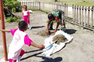TOP-NEWS.id, BIAK TIMUR – Babinsa Posramil 1708-01/Biak Timur, Sertu Petrus Mandosir bersama para guru dan murid TK Karmel Bosnik melaksanakan kegiatan kerja bakti membersihkan lingkungan sekolah di Kampung Adorbari, Distrik Biak Timur, Kabupaten Biak Numfor, Papua, Sabtu (4/10/2025).