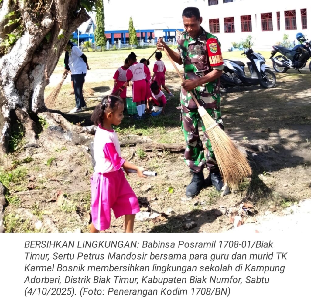 TOP-NEWS.id, BIAK TIMUR – Babinsa Posramil 1708-01/Biak Timur, Sertu Petrus Mandosir bersama para guru dan murid TK Karmel Bosnik melaksanakan kegiatan kerja bakti membersihkan lingkungan sekolah di Kampung Adorbari, Distrik Biak Timur, Kabupaten Biak Numfor, Papua, Sabtu (4/10/2025).