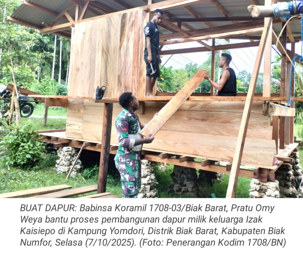 TOP-NEWS.id, BIAK BARAT – Sebagai bentuk kepedulian terhadap kesulitan yang dihadapi warga binaannya, Babinsa Koramil 1708-03/Biak Barat, Pratu Omy Weya membantu proses pembangunan dapur milik keluarga Izak Kaisiepo di Kampung Yomdori, Distrik Biak Barat, Kabupaten Biak Numfor, Papua, Selasa (7/10/2025).