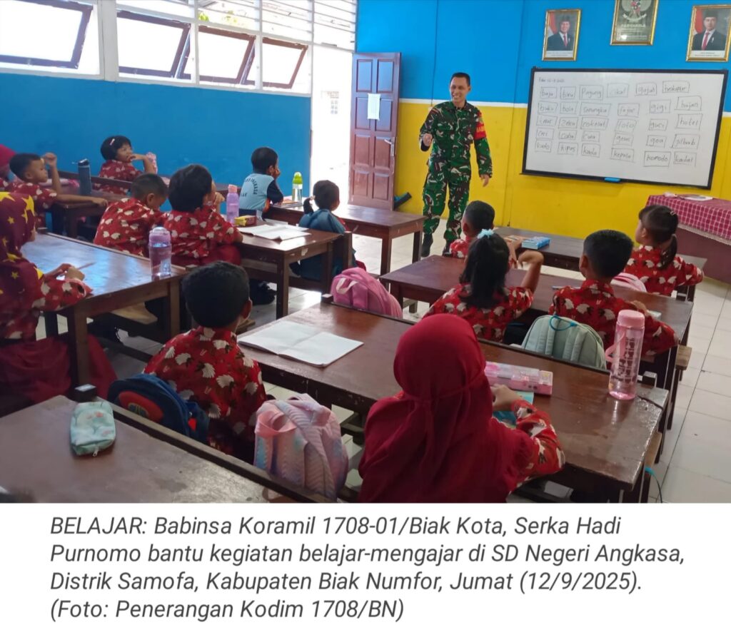 TOP-NEWS.id, BIAK – Babinsa Koramil 1708-01/Biak Kota, Serka Hadi Purnomo meluangkan waktunya membantu kegiatan belajar-mengajar di SD Negeri Angkasa, Distrik Samofa, Kabupaten Biak Numfor, Papua, Jumat (12/9/2025).