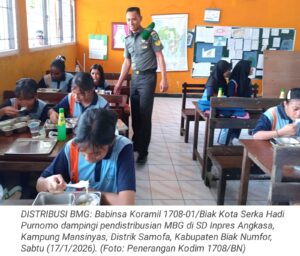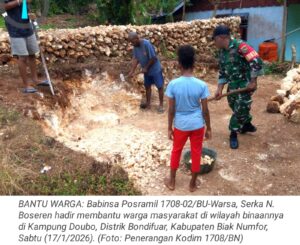TOP-NEWS.id, BIAK – Sebagai upaya mendukung pembangunan infrastruktur dan mempererat hubungan antara TNI dan masyarakat, Babinsa Koramil 1708-01/Biak Kota, Posramil 01 Biak Timur, Serka Umaraddin dan empat anggota, yakni Serka Dodik Fitrianto, Sertu A. F Lamere, Sertu Wahyu Hendro Patrias Setiawan, dan Serda Renold Mnsen karya bakti membantu warga memproses pembangunan gedung bank sampah di Kampung Inofi, Distrik Biak Timur, Kabupaten Biak Numfor, Papua, Selasa (15/10/2024).